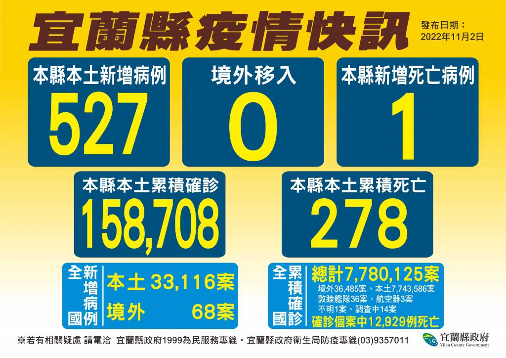 宜蘭縣今日(11月2日)新增527名確診個案Posted on2022-11-02Autor尖端新聞網留下足跡【尖端新聞中心】宜蘭縣今日(11月2日)新增527名確診個案,目前本縣累計個案數為158,708人。新增1名死亡個案,該名個案為70多歲男性,有慢性病史,已接種過4劑疫苗。他於10月17日確診,經搶救後,仍不幸於10月26日病逝。因應中央流行疫情指揮中心調整部分防疫規範,仍請縣民務必落實各項防疫規定:佩戴好口罩、加強手部衛生及咳嗽禮節;如果有類似呼吸道症狀,或有感染疑慮,一定要儘快篩檢,才能避免疫情擴散。分享此文:FacebookX相關