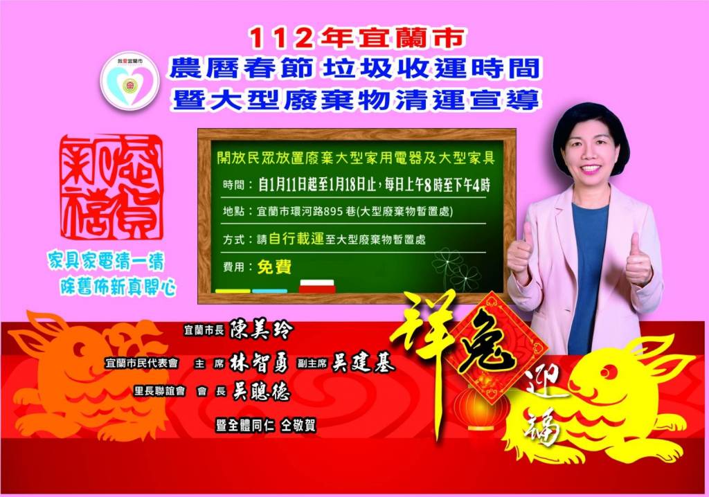 今年農曆春節假期長達10天,配合民眾開始除舊布新大掃除,宜蘭市公所為了加強為民服務,讓市民朋友過一個歡樂的新年,宜蘭市清潔隊在春節期間將停止非必要休假,加班服務積極清運垃圾,同時開放大型廢棄物暫置處,自1月11日起至1月18日,每日上午8時至下午4時,民眾可將家中廢棄的大型家具或電器,自行載運到環河路895巷指定地點放置,清潔隊當日委託業者協助清運,服務完全免費。另外如果民眾需要專車協助清運大型廢棄物,仍請親洽清潔隊繳費申請,受理期限至1月18日下午4時止,1月19日至1月29日暫停受理, 1月30日上午8時開始恢復受理申請。可上公所(www.ilancity.gov.tw)下載,或以手機下載安裝「樂圾通APP」查詢。