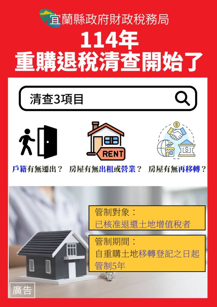 宜蘭縣政府財政稅務局表示,為杜絕退稅後,土地所有權人即將另購土地出售,或轉作其他用途,自5月1日起開始對重購自用住宅用地,已核准退還土地增值稅案件辦理清查作業,清查時間將持續到10月底。不論先賣後買或先買後賣自用住宅用地,凡是已申請並核准退還出售時繳納的土地增值稅,自重購土地移轉登記之日起到目前,仍在5年列管期間者,都是該清查對象。重購土地列管的5年內,都必須繼續作自用住宅用地使用,如發現下列情形,如再行移轉,或有遷出戶籍、供出租、營業等未符合自用住宅用地,將追繳原退還稅款。