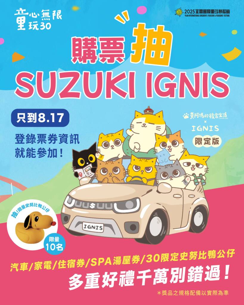 今年「遊童玩好康抽汽車」活動,只要購票或申辦童玩護照,就有機會把市價69.5萬元的Suzuki汽車開回家,其他獎項包括縣內五星級飯店住宿券、餐券、除濕機、電視機、電風扇、吹風機等總價超過160萬元,另外並特別加碼抽出童玩30官方紀念版史努比鴨公仔10隻,提醒遊客要上網登錄才能參加抽獎(登錄截止時間至8月17日下午4點)網址https://lottery.ilccb.gov.tw/。 更多活動資訊可上童玩節官網https://www.yicfff.tw/ 及臉書https://www.facebook.com/YICFFF/查詢。