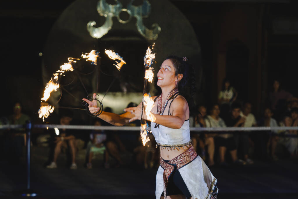 《魔幻仲夏 YA 傳藝》第二夜登場,預估人潮預估再次直逼萬人盛況!「福利熊」驚喜現身宜蘭傳藝園區,提早替「夜傳藝」暖場,讓園區瞬間熱鬧起來!逗得大小朋友笑聲不斷。沒跟上腳步的朋友別擔心,下週六(8/23)還有一次機會!記得把握時段來到文昌街、魯班街,和福利熊一起留下最難忘的仲夏回憶!夜傳藝在中央廣場以火舞演出點燃夏夜激情,火焰在夜空劃出金紅弧線,瞬間成為園區最亮眼的風景,將夜空映照得熠熠生光,火光隨著節奏翻飛閃耀,帶來震撼人心的視覺盛宴,8/23-8/24炫酷特技表演接力登場,星空下的傳藝園區搖身一變成為流動舞台,讓親子同遊的家庭可以在文化氛圍裡體驗火光舞動的震撼,留下難忘的仲夏回憶。園區月河廣場隨水波映照光影,悠揚的琵琶聲在晚間響起,編織出專屬仲夏夜的親子樂章,讓大小朋友都能在宜蘭的夏夜裡找到最動人的回憶。