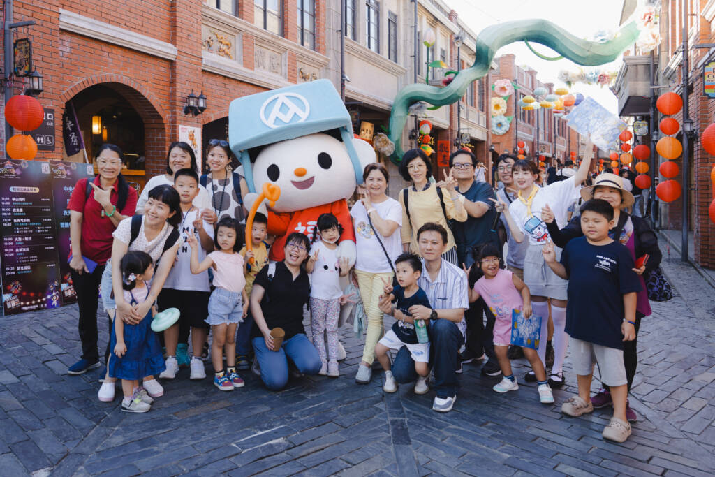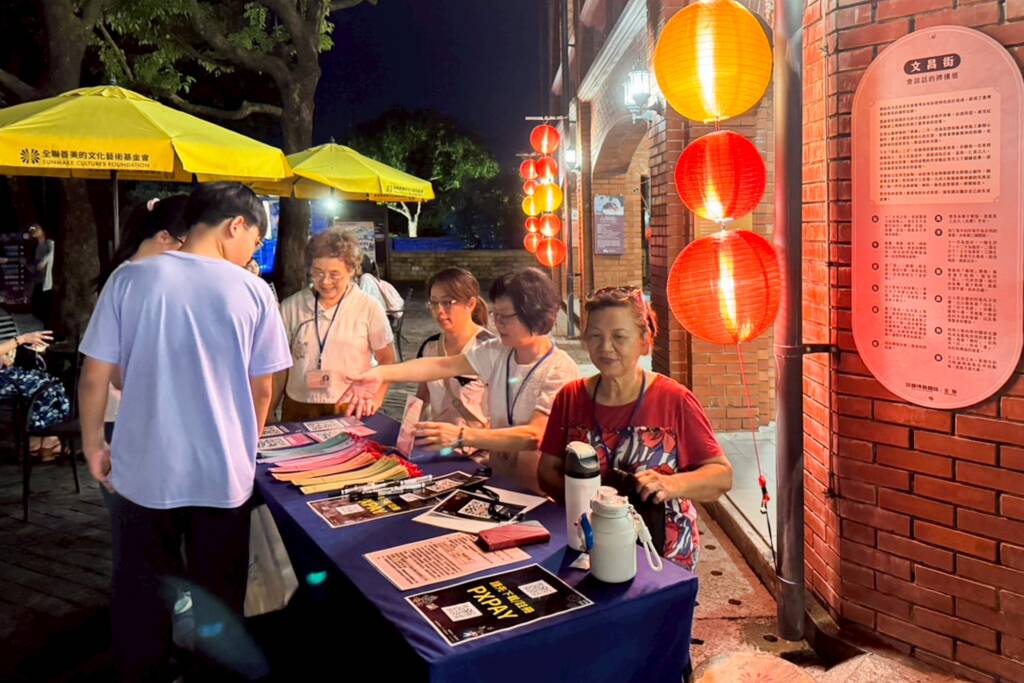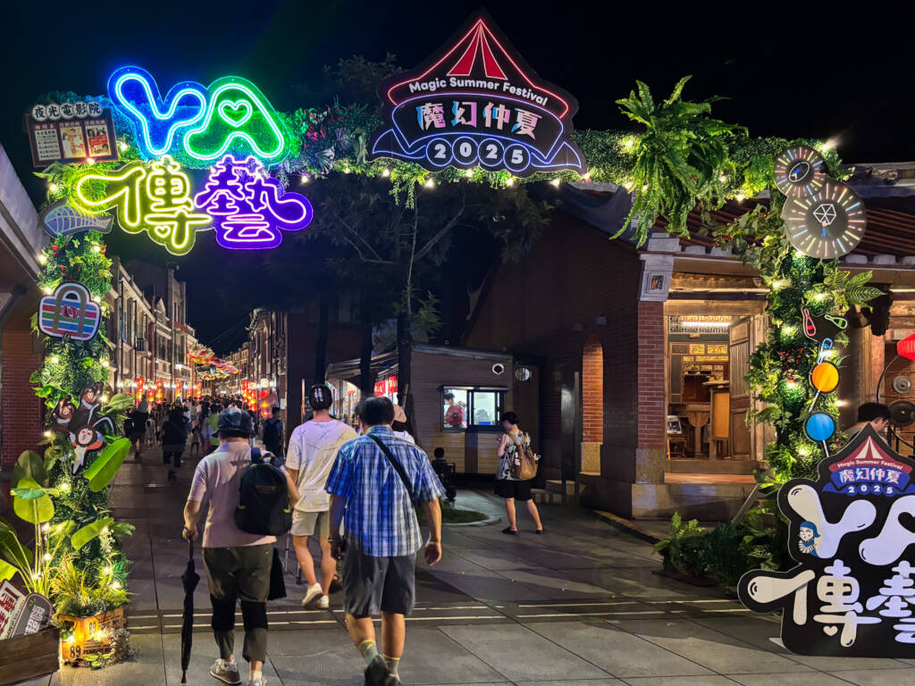 園區內限定的「微醺市集」也同步開張,市集主打輕食、特色飲品與趣味互動攤位,隨著夜間火舞、音樂演出陸續展開,市集氣氛也逐漸升溫,成為園區中最受歡迎的散步亮點之一;除光影場域與經典電影外,「NPC復古派對」成為當晚人氣焦點,多位身著民初服飾的NPC穿梭在紅磚街巷間,與遊客即興互動、現場對詩、講古問路,讓遊客彷彿穿越時空,走入一場復刻版的傳藝小鎮之夜,NPC復古派對將於8/17、8/23–24繼續登場,歡迎民眾換上復古服飾、加入這場夜間限定的角色派對,在光影與笑聲中寫下屬於自己的時空紀事。