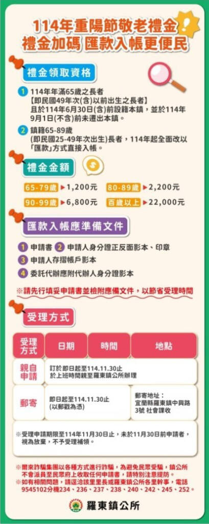 羅東鎮重陽節敬老禮金致贈對象為當年度年滿65歲(49年次),並於當年度6月30日(含)前已設籍羅東鎮,且於當年度9月1日(不含)前戶籍未遷出本鎮之長者,今年約有近1萬4,000名長者符合領取資格。同時自本(114)年起,凡65-89歲長者,改以匯款方式發放禮金,長者只需申請一次,往後每年只要符合資格都會優先入帳,快速又便民。