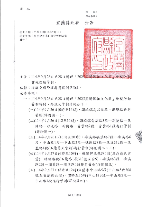 2025年蘭陽媽祖文化節從114年9月26日開始至28日止為期3天在宜蘭縣內舉行繞境、鑽轎腳、平安符活動,於27及28日繞境隊伍在羅東分局轄內,為因應大量的人潮車潮湧入,羅東分局縝密規劃警力加強疏導維持交通秩序,並提供以下資訊供民眾參考: