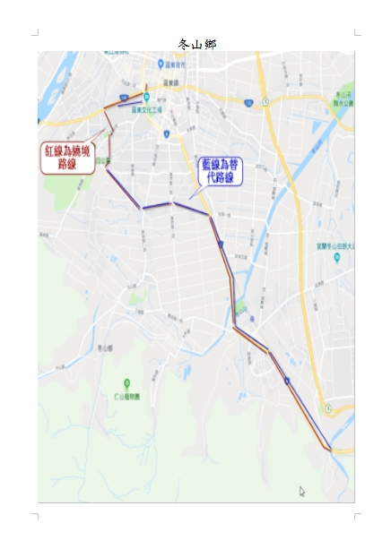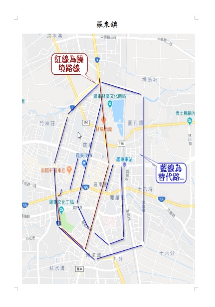 (二)替代路線:1.9月27日往羅東市區穿越性車流的可改道行駛縣道191-右轉進入五結路、光榮路-直行至羅東市區。2.9月27日夜間與9月28日早上路線大致於羅東市區內,可多行駛環鎮道路(純精路、光榮路)再到達目的地。3.9月28日中午後往順安地區穿越性車流的可改道行駛台九線及義成路段。