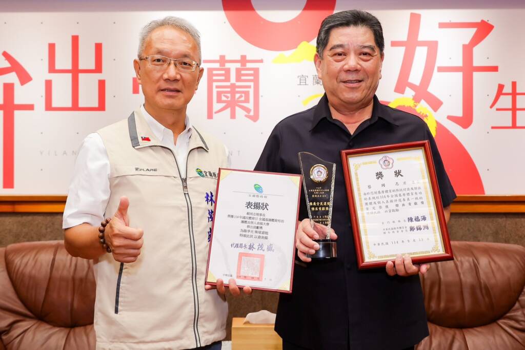 宜蘭縣政府於10月7日上午,在縣長會客室由林茂盛代理縣長親自祝賀宜蘭縣體育會蔡岡志理事長,並表揚其榮獲中華民國縣市體育會聯合總會辦理「114年國民體育日 全國基層體育有功團體及個人表揚大會」的「傑出貢獻獎」,全國僅有4位獲此殊榮,為宜蘭之光。蔡理事長任職宜蘭縣體育會理事長近8年,將於114年12月卸任,任職理事長一職期間致力推展基層體育、推動全民運動,成績卓越,備受肯定。