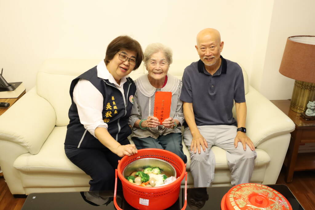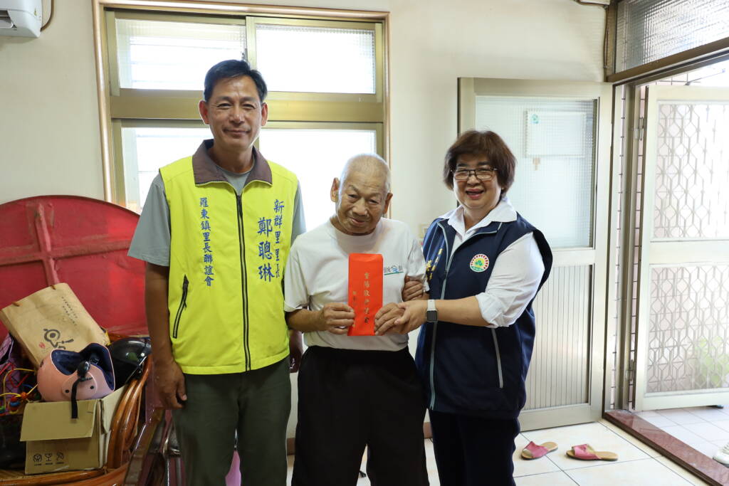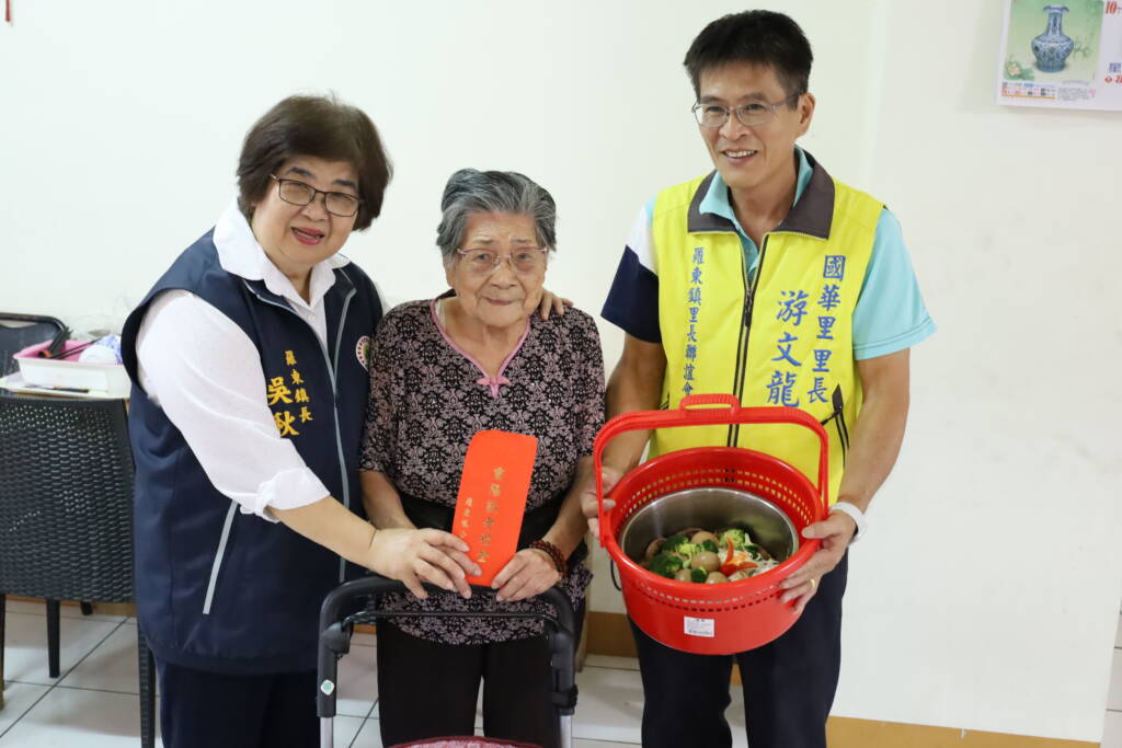 羅東鎮長吳秋齡於重陽節前夕特別向張游罔百歲人瑞祝賀,親自致贈人瑞重陽禮金2萬2,000元及長壽豬腳麵線,表達敬重關懷之意,同時也祝福人瑞健康平安。今年剛滿百歲的人瑞代表—張游罔女士,身體健朗、個性活潑,平時注重養生,還特別透漏她喜歡吃魚頭補充營養。