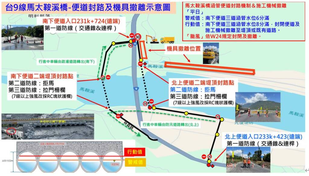 花蓮地區「台9線231k+952馬太鞍溪橋南下及北上臨時便道」,因受熱帶擾動96W預估於10月17日增強為第24號颱風「風神」(Fengshen)及其外圍環流影響,預期將與東北季風產生共伴效應,可能造成降雨及水位上升風險。為確保用路人安全,公路單位將依下列情形啟動預警性封閉便道措施:1、依中央緊急應變協調中心指示需封閉便道時。2、依林保署通知紅色警戒需封閉便道時。3、監測涵管便道水位達行動值時。4、地震5弱立即封閉、4級持續觀測警戒。屆時將即時封閉「台9線231k+952馬太鞍溪橋南下及北上便道」,禁止人車通行,並將視後續降雨與水位情形調整開放或持續管制,屆時請用路人行駛替代路線,以維護行車安全。