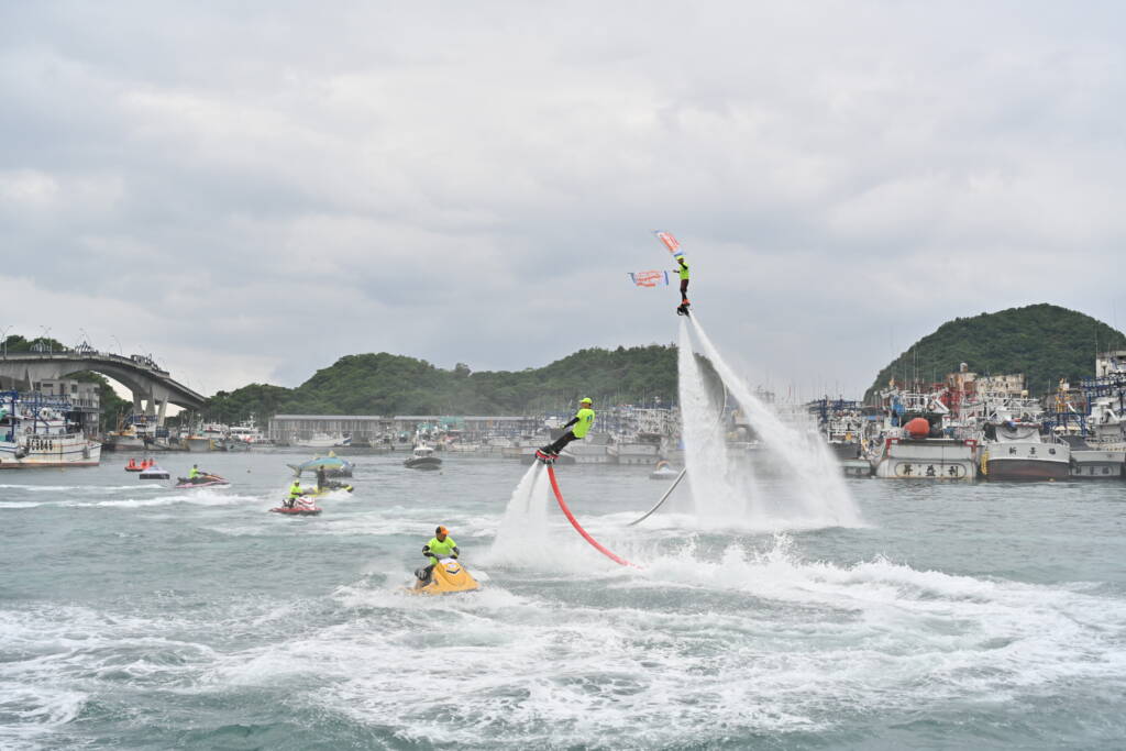 第二,「鯖」光啟動:水上鋼鐵人×海巡艦鳴笛點亮開幕儀式,由兩位「海上鋼鐵人」飛人手持大漁旗升空揭幕,與代理縣長林茂盛等人共同啟動「鯖海LED光影儀式」,象徵「從鯖開始」的永續行動正式展開。海巡艦鳴笛與漁船聲響交織成海港最熱血的序曲,宣告南方澳的海洋新篇章。