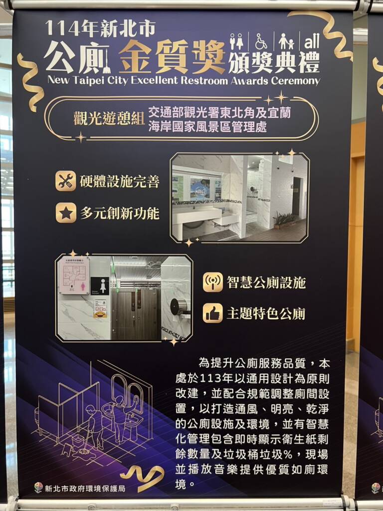 114年度公廁評鑑結果揭曉,交通部觀光署東北角及宜蘭海岸國家風景區管理處(下稱東北角管理處)榮獲新北市及宜蘭縣公廁評鑑金質獎及銅質獎共計3個獎項,其中福隆遊客中心公廁榮獲新北市「觀光遊憩組」金質獎,草嶺隧道南口及壯圍沙丘旅遊服務園區1F室外公廁分別獲得宜蘭縣「觀光地區及風景區」公廁評鑑金質獎及銅質獎。