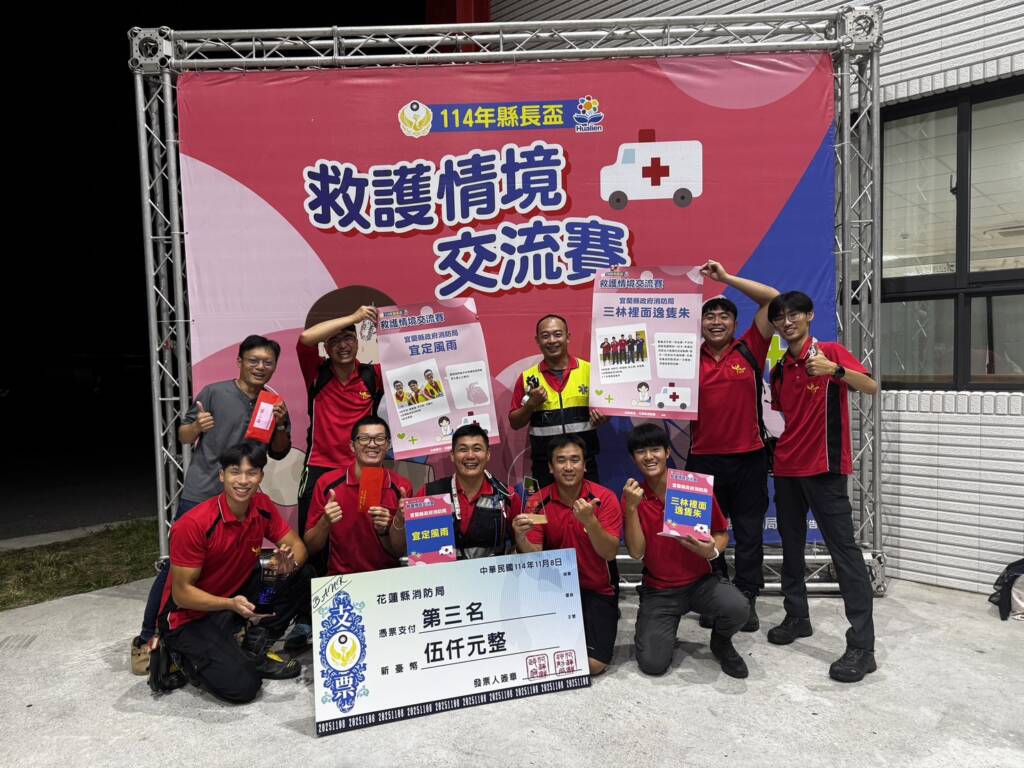宜蘭縣消防局共派出2隊,在初賽四大關卡表現穩健,尤其在呼吸道情境處置與內科情境評估項目展現高度默契與精準操作,其中「宜定風雨」隊成功晉級決賽。在最終決戰的大量傷患情境中,面對「地震災害融和車禍現場,多名傷患同時倒地、時間壓力極大、資源有限」的模擬現場,宜定風雨隊迅速啟動START分級,確實完成分流、救援及通報流程,展現專業急救能力與冷靜判斷,最終脫穎而出獲得季軍。