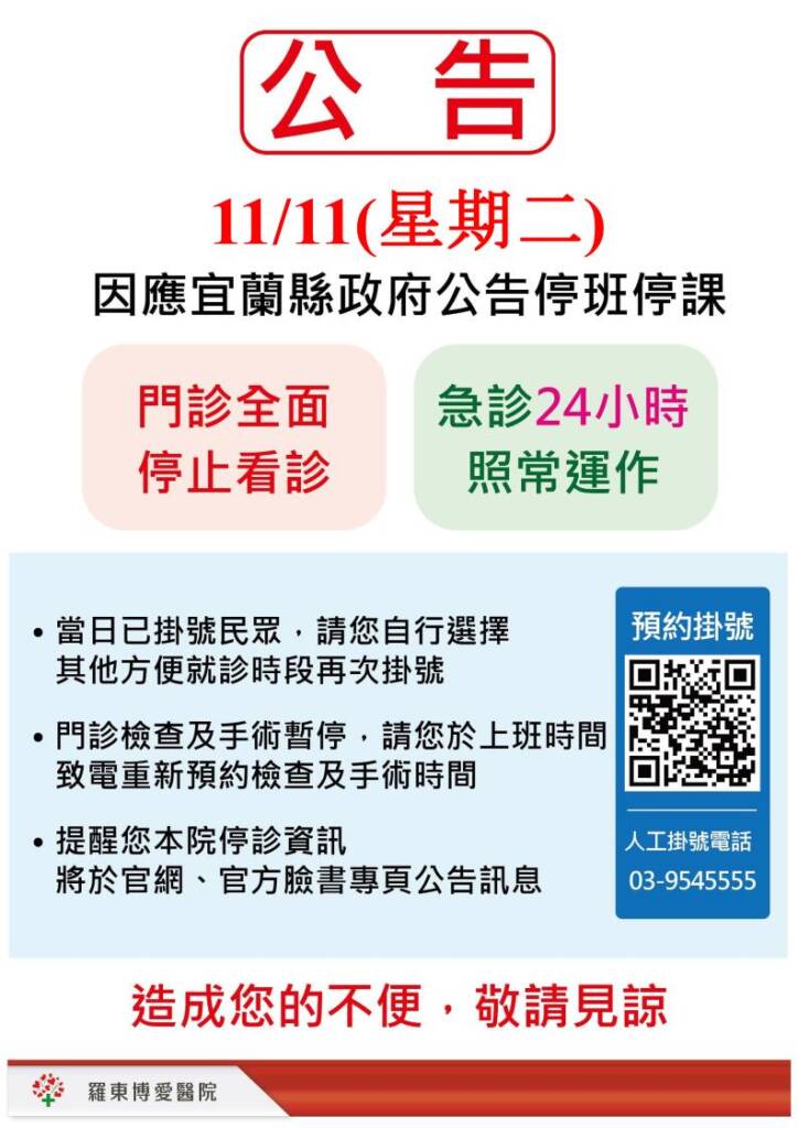 颱風來襲,羅東博愛、聖母醫院11/11門診暫停服務以確保安全急24小時提供醫療服務Posted on2025-11-102025-11-10Autor尖端新聞網留下足跡(尖端新聞中心)因應鳳凰颱風影響,羅東博愛醫院、聖母醫院將於11/11(二)依照縣府停班停課標準實施調整,門診暫停服務以確保安全。博愛醫院表示,我們的急診室仍24小時提供醫療服務,無論風雨再大,我們都會守護您的健康。特別感謝所有颱風天依然堅守崗位的醫護同仁,無懼風雨,確保醫療不中斷❤️貼心提醒:📅 已掛號的民眾請自行改約其他看診時間🔬 門診檢查及手術停止,請於上班時間致電重新安排時間。分享此文:FacebookX