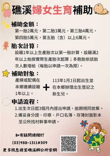 礁溪婦女生育補助依胎次遞增,第一胎2萬元至6萬元等Posted on2025-11-11Autor尖端新聞網留下足跡【尖端新聞中心】為了讓大家在礁溪安居樂業、幸福成家,礁溪鄉公所推出一系列「幸福有感政策」,以實際行動支持鄉親婚育,共創美滿生活!鼓勵結婚:每對新人可領取結婚補助1萬元,讓幸福從登記那一刻開始加倍甜蜜。鼓勵生育:婦女生育補助依胎次遞增,第一胎2萬元、第二胎3萬元、第三胎4萬元、第四胎5萬元、第五胎(含)以上6萬元,陪伴每個家庭迎接新生命的喜悅。育兒支援:為減輕爸媽育兒負擔,凡設籍礁溪且未滿2歲的嬰幼兒,每月可領營養費補助3000元,最長可領24個月,讓寶寶健康成長、爸媽感受扶持。礁溪鄉公所歡迎大家設籍礁溪「成家立業、幸福礁溪」不論是準新人、新手爸媽或鄉親長輩,都能感受到公所滿滿的關懷與支持。 一起在礁溪築夢、幸福生活,就從現在開始!分享此文:FacebookX