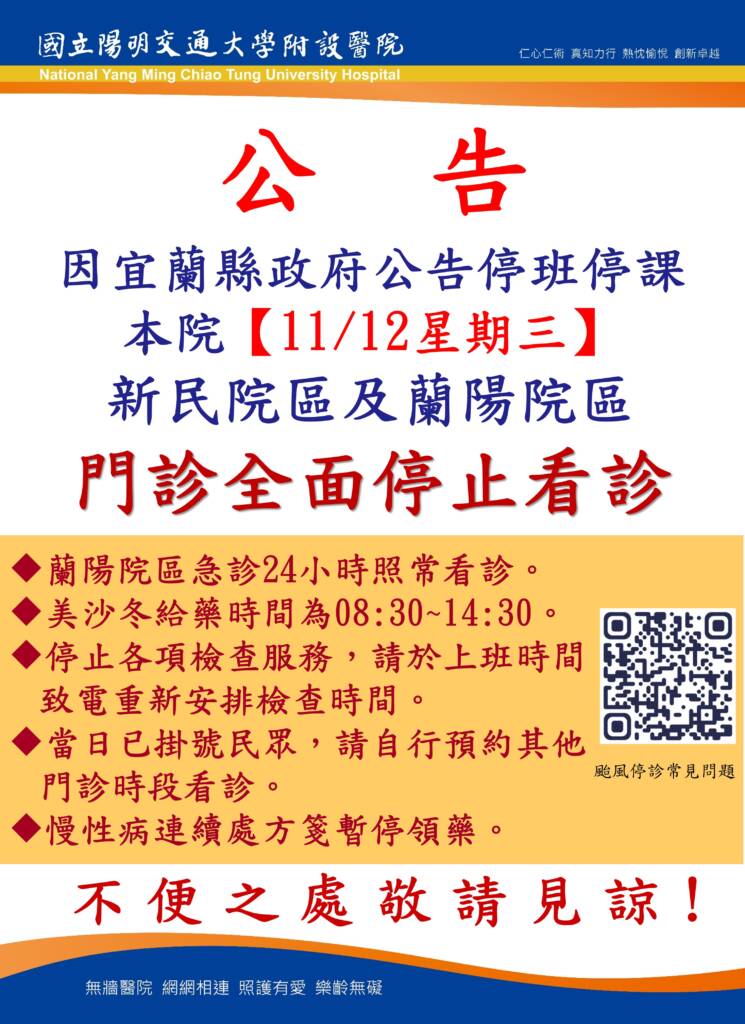 ~~颱風來襲公告~~因宜蘭縣政府發佈停班停課公告,國立陽明交通大學附設醫院【11/12星期三】新民院區及蘭陽院區門診全面停止看診。相關醫療服務資訊如下:門診服務:新民院區及蘭陽院區門診全面停止看診。