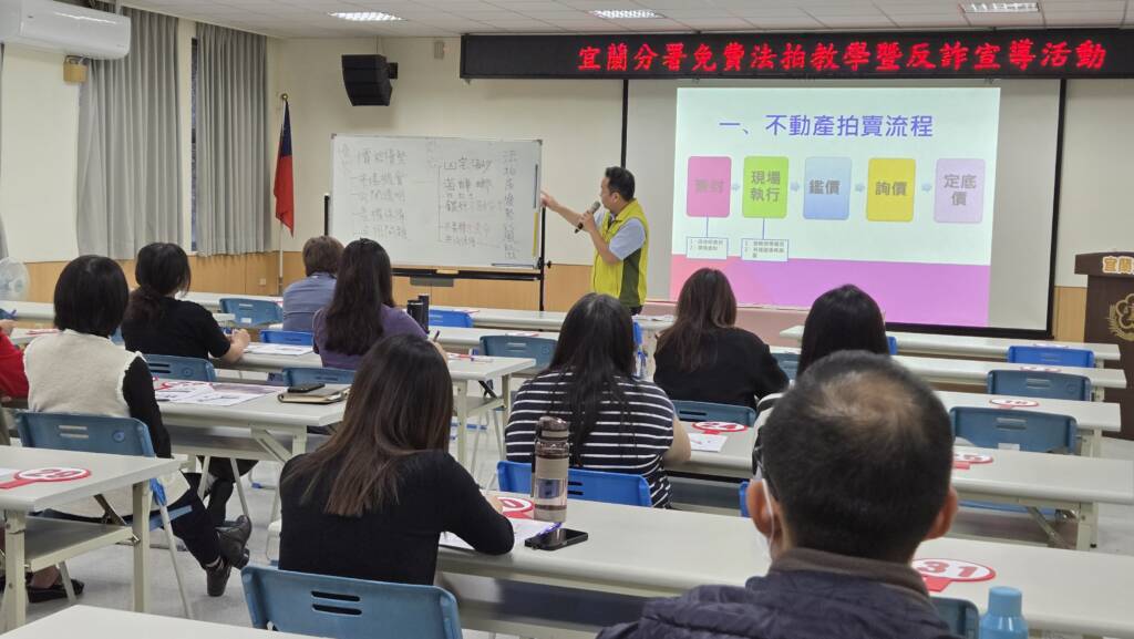 為落實行政院「五打七安」政策中「反詐」行動,提升民眾對不動產法拍程序了解,避免誤入詐騙陷阱等,法務部行政執行署宜蘭分署11月24日(週一)上午在宜蘭市中山路二段261號,特別規劃一場結合「不動產法拍教學」與「反詐宣導」活動。以「法拍宜點靈」為主題,免費講授法拍技巧及進行反詐宣導,活動指派資深之行政執行官,提供全程免費的法拍實務教學課程。深入淺出地解析法拍屋執行程序、拍賣資訊查詢運用、投標流程,並講授快速辨識有效投標保證金支票技巧、繳納拍定尾款及過戶作業、點交與不點交等交屋細節,以及常見的投標爭議所在,幫助民眾掌握正確的法拍知識,保障自身權益。吸引來自店家、仲介業、補教界、學生、公部門、退休人士等各領域民眾踴躍參與,反應熱烈!