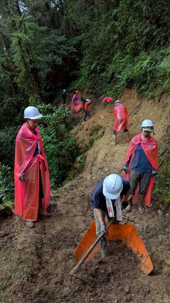 今年主要挑戰為一段長達50公尺的大規模崩塌地。雖已崩塌數十年,但土石仍鬆散、穩定性低,在地人稱為「烙屎石仔」。為確保安全,初期由熟悉地形的在地師傅進場,以鋤頭開路、剝離植被,再以二齒與三齒釘耙逐層運下土石,直至露出上邊坡內側的圳壁與圳頂。其後才由工作假期的志工接力,以大量人力從平地挖掘出圳溝,在克服底部各種大小石子阻礙的同時,反覆確認前後水平高程,確保日後通水順暢。