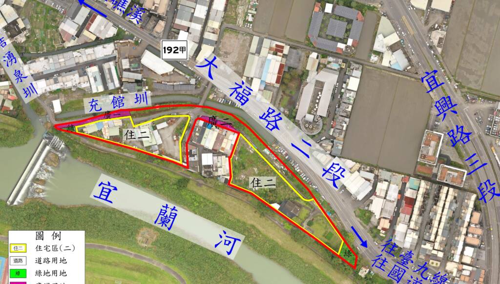 縣府指出,新生重劃區基地南側緊鄰宜蘭河,北側則為充館圳及金同春圳,三面環水的地理條件形塑出獨特的水岸景觀特色。縣府在規劃過程中,串聯宜蘭河堤岸周邊自然資源,透過綠地、滯洪池與道路系統等多功能空間設計,兼顧防汛安全與民眾休憩需求,營造親水且適合鄰里交流的生態宜居社區。
