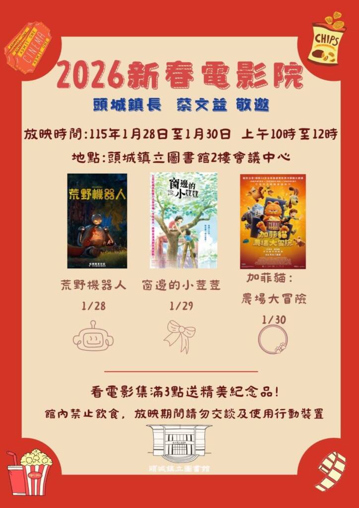 快樂的寒假到了,隨著年節氣氛日漸濃厚,頭城鎮公為提供親子一個休閒空間特别在1月28-30日上午10:00-12:00在圖書館二樓多功能會議廳,啟用百萬全新的影音設備,連續辦理3場「2026頭城新春電影院活動」,鎮長蔡文益表示,漫長的寒假小朋友在家缺乏親子互動機會,公所藉由推廣電影藝術,提供鄉親、學童及青少年優質影視娛樂去處。為鼓勵鄉親大小朋友來觀賞公所更精心準備紀念品,凡看電影集滿3點,即可兌換精美禮物,送完為止。歡迎請鄉親們多多利用圖書館空間,共同歡度快樂時光。