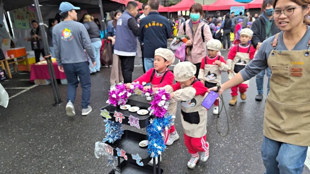 義賣活動中最精彩的是小小廚師們現場製作的「鎮長媽媽的甜米糕」、「三色米卡龍」、「奶油烤年糕」、「紅運蘿蔔糕」、「香貢貢ㄟ~油飯、魚丸湯+自己種的香菜」、「甜心米餅」、「Q彈砵仔糕」及「好運來「蘿」!」等創意米食料理,透過師生「從土地到餐桌,再將愛心送出去」的學習歷程,孩子們在心中種下了關懷社會、樂於付出的種子,讓善意在社會中持續循環延伸。