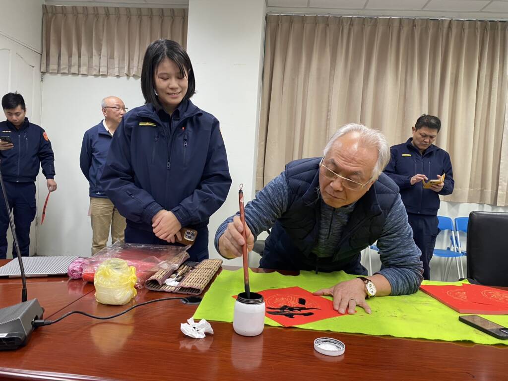 活動中,江煥長老師現場揮毫書寫多幅春聯與墨寶,筆力雄健、寓意吉祥,不僅展現傳統書法藝術之美,也寄託對地方平安順遂的祝福。讓平日忙於勤務的員警同仁在緊湊工作之餘,得以感受藝文薰陶與節慶溫暖,現場洋溢喜氣與歡樂氛圍。
