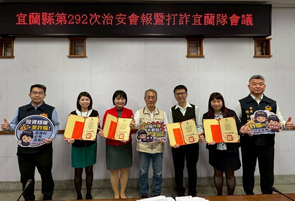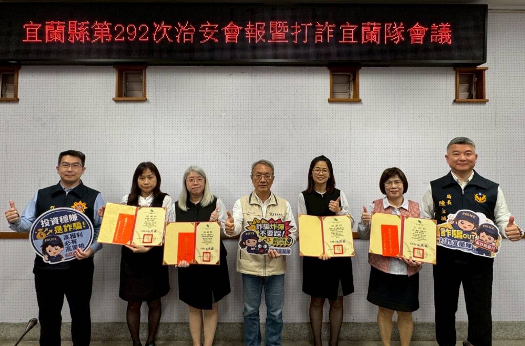 宜蘭縣政府為感謝金融機構積極攔阻詐騙案件,代理縣長林茂盛於(2)月24日藉由治安會報表揚機警行員之義行,並頒發感謝狀予有功人員,期望透過公開表揚方式,強化全民打擊詐欺犯罪信心,暢通警民良好之通報機制。