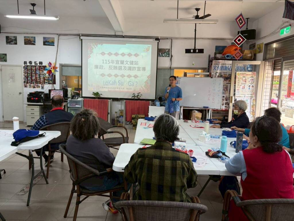 因應年底大之選及強化原鄉民眾反賄識詐觀念,宜蘭縣政府文化局(2)日前進大同鄉英士文化健康站,舉辦一場別開生面的「反詐騙、反賄選」宣導活動,文化局政風處主任謝孟樵和原鄉長者面對面開講。現場氣氛熱絡,笑聲與掌聲此起彼落,在輕鬆互動中,把重要的法治觀念帶進部落日常。