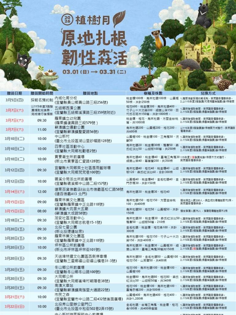 林業保育署宜蘭分署提醒您,各場次贈苗活動苗木索取方式不同,請民眾就近領取苗木時,參考各場次須知事項。活動詳情請參閱「植樹月贈苗活動一覽表」(https://url.forest.gov.tw/115tree)(如有異動會以紅字標示,提醒您出發前務必再次確認資訊)或至林業及自然保育署宜蘭分署臉書專頁查詢。
