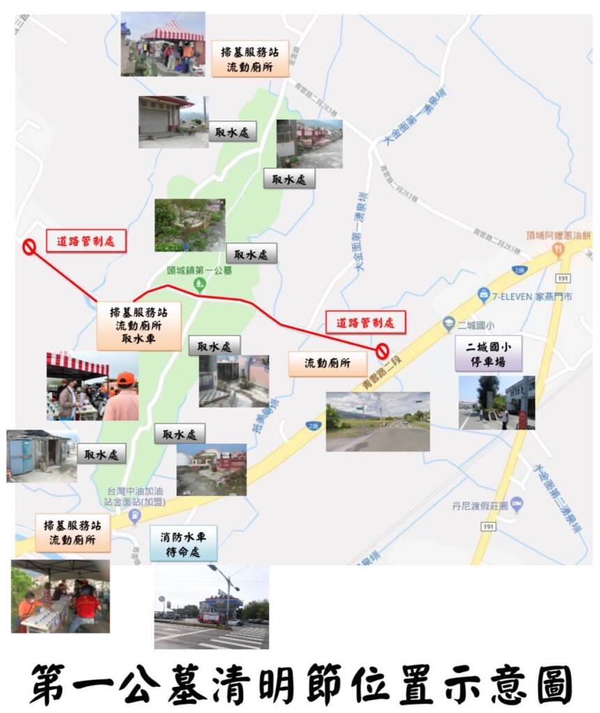 - 掃墓服務台:時 間:4月5日當天上午 6 時至 13 時止。地 點:土地公廣場、金面加油站對面及金面中路轉角共三處。服務項目 :提供水桶、鐮刀、手套、垃圾袋、飲用水、清潔用水、 急救包。環保宣導:為減少空氣汙染及火災發生,鼓勵掃墓民眾金紙統一集中焚燒,民眾將紙錢送交至各服務台統一集中,即贈送環保宣導品一份。流 動 廁 所:於第一公墓內分四處設置七座流動廁所。專 用 停 車 場:商借二城國小開放校園及周邊提供接駁車及掃墓民眾停放汽、機車。