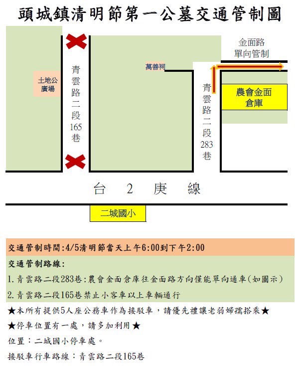 - 交 通 疏 導:主區第一公墓的主要通道,於4月5日凌晨6時起進行交通管制,其中青雲路165巷全面禁止自小客車以上車輛進入、青雲路二段283巷則採單向通行,並協調交通警力指揮交通,以利交通順暢。