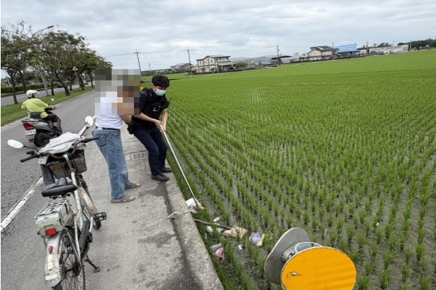 新宜蘭分局延平派出所警員徐振軒、郭峻瑋4月5日擔服10至12時備勤勤務時,接獲110通報稱:轄內縣民大道與環市東路口處,有交通事故,請前往處理。徐、郭二員接獲通報立即趕往,經到達現場了解,係一名老翁騎乘電動自行車,行經該處時,疑因強風重心不穩自摔,致自行車籃內物品掉落至一旁稻田裡,因老翁年事已高且患有氣喘,警方見剛插秧後的稻田泥濘,且與道路落差甚高,遂由警方至一旁的農機維修廠,借了一雙農作雨靴及一根竹竿,換穿上雨靴後,主動協助老翁爬落稻田裡,一一的將老翁的掉落物拾起,路過民眾紛紛向警方比讚!老翁非常感謝警方的協助,頻頻向警方道謝。