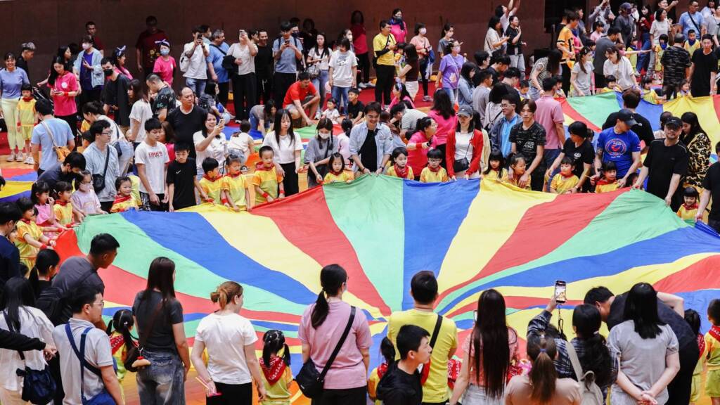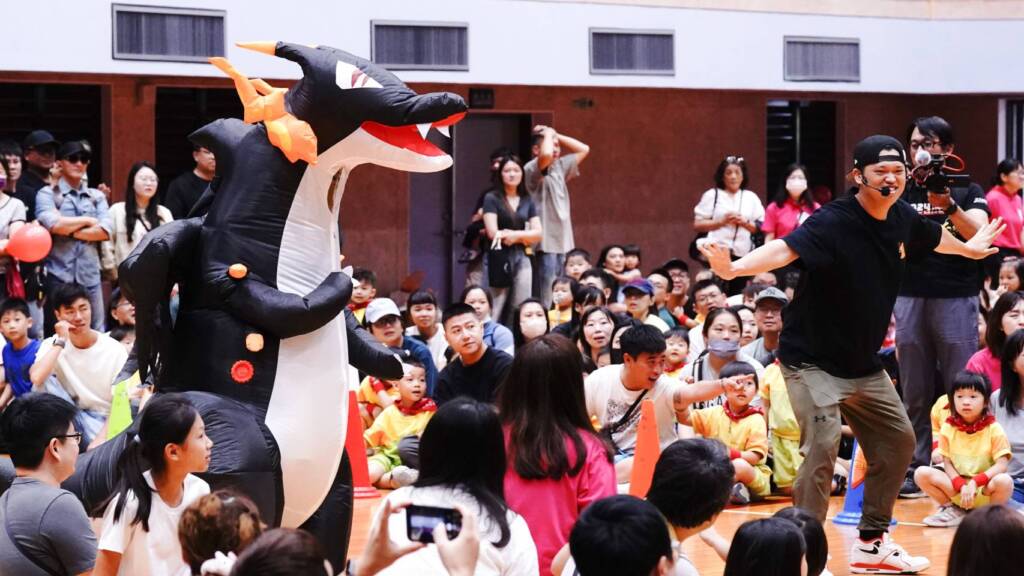 親子闖關熱力飛揚:親子共同參與「萬馬奔騰」與「超級馬力夯」等遊戲,家長需與孩子協力跨越障礙、拍擊寶物,不僅訓練幼兒的肢體協調,更在互動中增進家庭情感。活動高潮由老師扮演噴火龍驚喜現身,孩子們透過拍打泡泡進行「攻擊」挑戰,現場笑聲不斷。