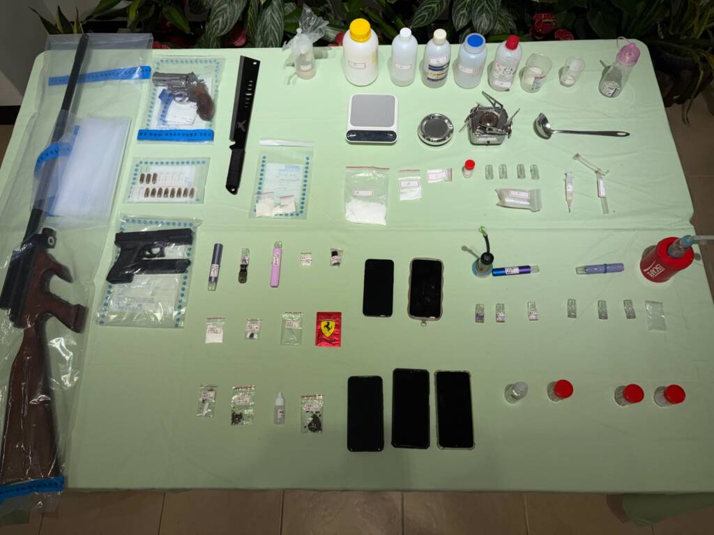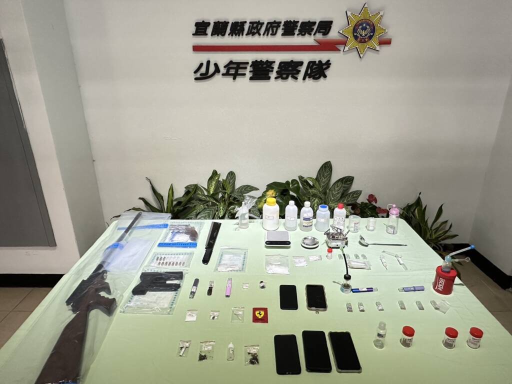 局長陳金城知悉後立即指示,結合礁溪分局及刑事警察大隊成立專案小組全力查緝,於115年4月20日見時機成熟執行收網,查獲簡嫌夫妻等6人到案,並查扣改造左輪手槍1把、改造長槍1把、子彈11顆及依托咪酯(190.78公克)、海洛因(10.61公克)、大麻(4.38公克)、毒咖啡包(2.45公克)、安非他命(0.52公克)等毒品,以及製造分裝依托咪酯相關原料、器具一批,全案詢後依違反毒品危害防制條例、槍砲彈藥刀械管制條例移送臺灣宜蘭地方檢察署偵辦;另簡嫌夫妻通緝部分,分別解送4個通緝機關歸案。
