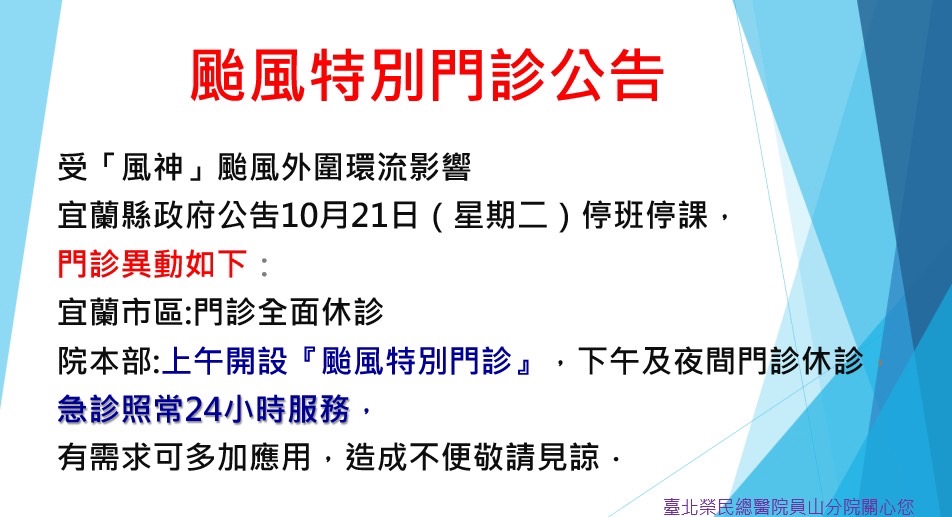(尖端新聞中心) 受「風神」颱風外圍環流影響,北榮員山及蘇澳暨分院10/21(週二)兩分院院本部皆於上午開設「颱風特別門診」,下午及夜診休診。 宜蘭市區門診部、蘇澳附設門診全面休診。蘇澳洗腎室及兩院院 …