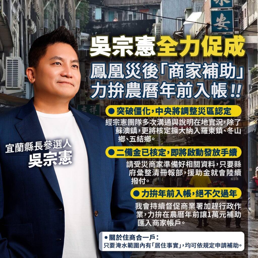 【尖端新聞中心】 針對去年鳳凰颱風造成宜蘭嚴重水患,許多受災商家遲遲未獲補助。對此,縣長參選人吳宗憲昨(27)日宣布重大進展!經團隊連日密集與經濟部商業署、水利署協調,中央表示已核定動支「第二預備金」 …